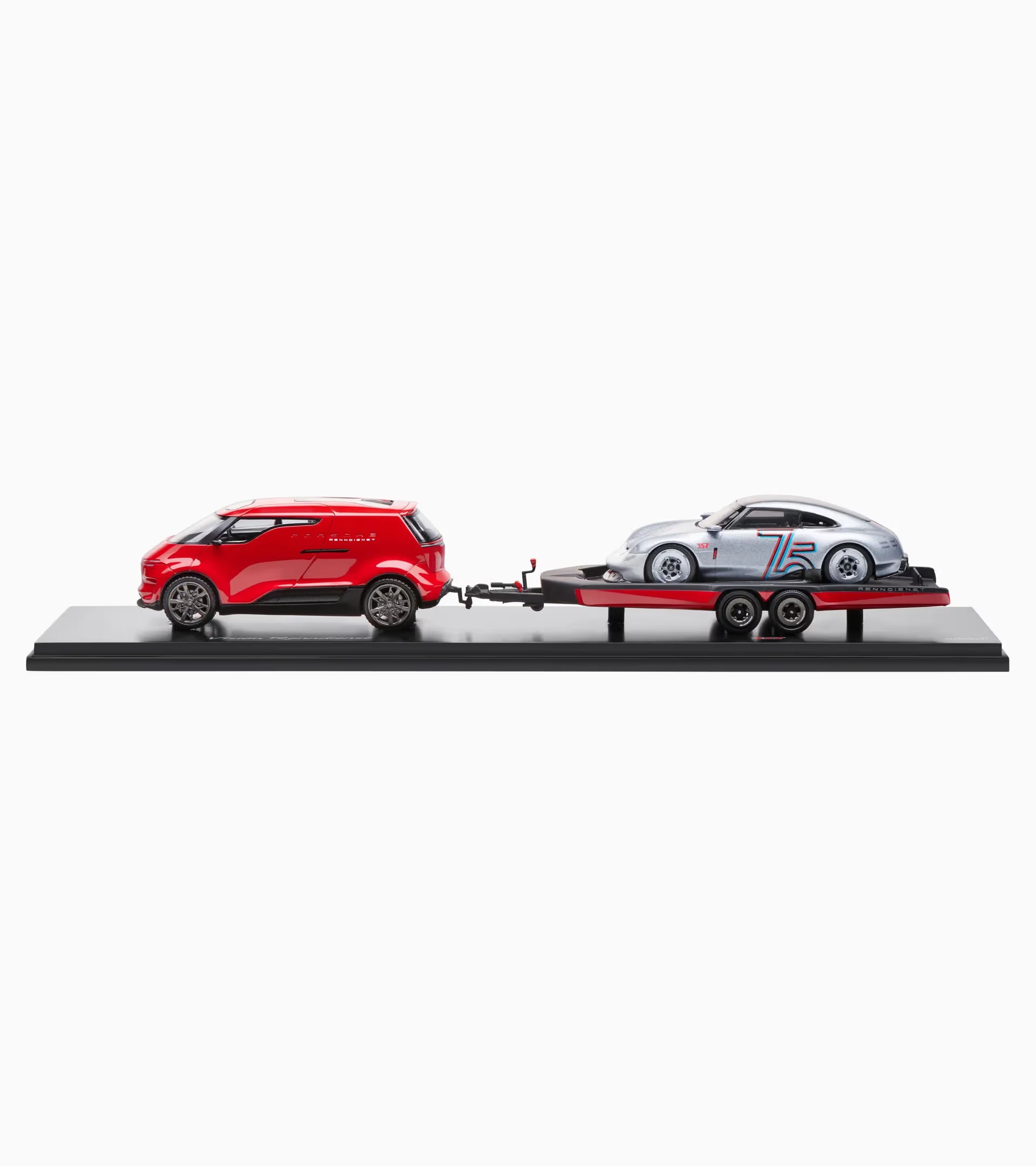 The exclusive 1:43 scale model of the Porsche Vision Racing Service with the Porsche Vision 357 on the trailer, showcases impressive attention to detail and deserves its place in any collection. With the included exclusive packaging, it becomes the perfect gift for every Porsche fan. Made of resin. Red exterior Vision Racing Service, Black interior. Multicolour exterior Vision 357, Black interior.