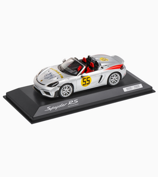 The exclusive 1:43 scale model of the Porsche 718 Spyder RS (982) showcases impressive attention to detail and deserves its place in any collection. With the included exclusive packaging, it becomes the perfect gift for every Porsche fan. Die-cast. Silver exterior, Black interior.