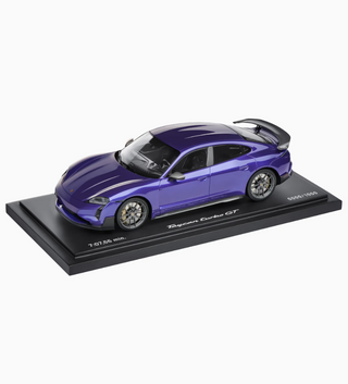 The exclusive 1:18 scale model of the Porsche Taycan Turbo GT (J1 PA) with Weissach Package showcases impressive attention to detail and deserves its place in any collection. The packaging also makes it the perfect gift for all Porsche fans.