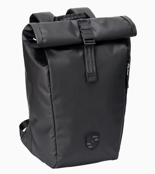 Hit the road in style: the Porsche Lifestyle roll-top backpack made of tarpaulin material combines design and function. The spacious main compartment with separate notebook compartment is ideal for those who like to work in nature. There is also a safe place for small essentials in the slot and zipped compartments. The padded mesh back and the adjustable and ergonomically shaped shoulder straps guarantee particularly a high level of comfort. The shiny 3D Porsche Crest on the front is an optical highlight. The exclusive look of the backpack is rounded off by details such as the 'Cayenne' logo on the side and the reflective zip tape.