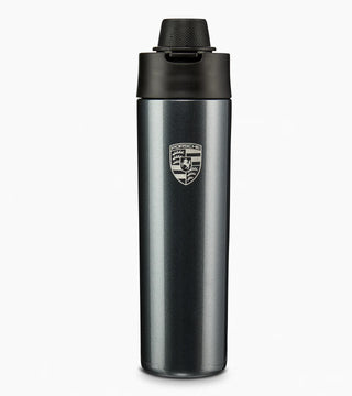 For long journeys or daily use, this stylish drinking bottle keeps your drink at a steady temperature. Made of double-walled stainless steel, carefully painted and adorned with a laser-engraved Porsche Crest, it is both stylish and functional. The lid is particularly striking, with a design reminiscent of the Drive Mode button on a Porsche steering wheel and featuring embossed Porsche lettering.